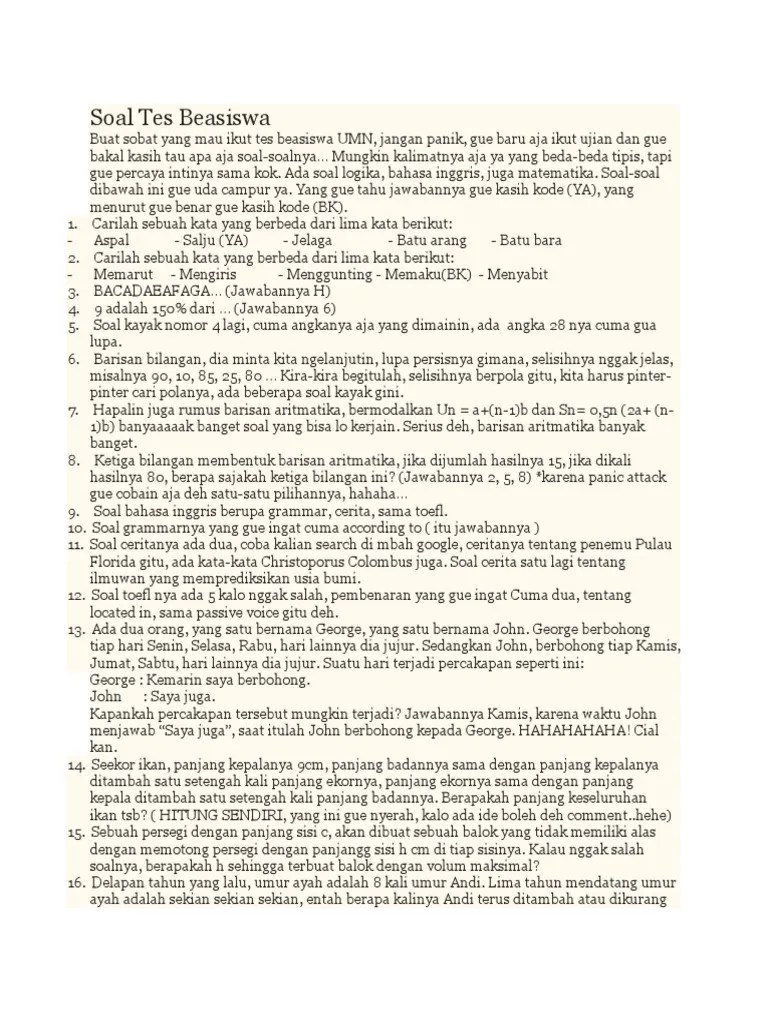 Adapun beasiswa tersebut di antaranya 515 beasiswa untuk s1 dan 75 beasiswa untuk jenjang s2. For more information, klik osc.metrotvnews.com. Mengerjakan soal tes (seleksi) masuk smp (mts). Pemerintah salah langkah memberikan restu untuk rektor universitas indonesia (ui) ari kuncoro rangkap jabatan sebagai komisaris bumn. Selama 2 minggu terakhir pasien tidak menggunakan alat ortho lepasannya karena… My way naskah soal umpn 2014 bidang tata niaga. Beasiswa arah pemuda indonesia 2020 untuk mahasiswa d3 d4 s1 baca juga: Peserta yang telah mengikuti test, dapat melihat pengumuman peserta yang lolos seleksi tahap pertama pada website osc.medcom.id pada tanggal 10 november 2020. Setiap soal yang dijawab benar akan mendapat skor 1, salah mendapatkan skor 0, tidak dijawab mendapatkan skor 0 Persyaratan osc medcom setiap peserta osc. Berikut adalah contoh surat rekomendasi beasiswa, yaitu 14. Jadi jangan berharap kamu bisa minta jawaban matematika sama aplikasi. Tes tulis ini ditempuh bagi calon penerima beasiswa yang telah dinyatakan lulus seleksi dokumen di bagian awal.